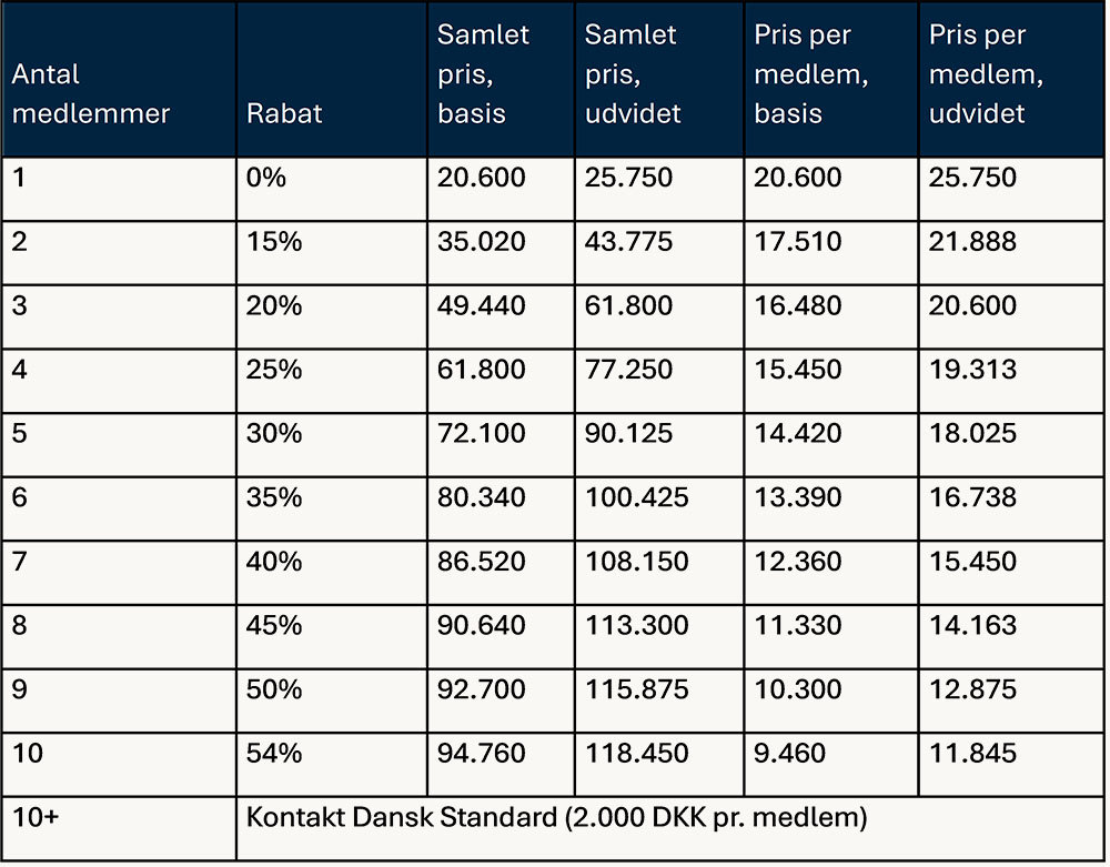 Prisen for at være medlem af et standardiseringsudvalg afhænger af aktivitets- og serviceniveauet i udvalget. Derudover gives der også rabat til nogle typer virksomheder og organisationer. Dansk Standard fik ny prisstruktur i januar 2025. Få overblik over priserne her.
